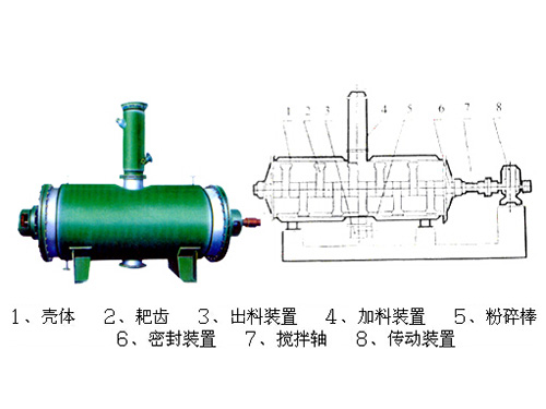 真空耙式干燥機(jī)具有結(jié)構(gòu)簡單,操作方便,使用周期長,性能穩(wěn)定可靠,蒸汽耗量小,適用性能強(qiáng),產(chǎn)品質(zhì)量好,特別適用于不耐高溫、易燃、調(diào)溫下易氧化的膏狀物料的干燥,該機(jī)經(jīng)用戶長期使用證明是一良好的干燥設(shè)備。原理:被干燥物料從殼體上方正中間加入,在不斷正反轉(zhuǎn)動的耙齒的攪拌下,物料軸向來回走動,與殼體內(nèi)壁接觸的表面不斷新,受到蒸汽的間接加熱,耙齒的均勻攪拌,粉碎棒的粉碎,使物料表面水分有利的排出,氣化的水分經(jīng)干式除塵器、濕式除塵器、冷凝器,從真空泵出口處放空。
